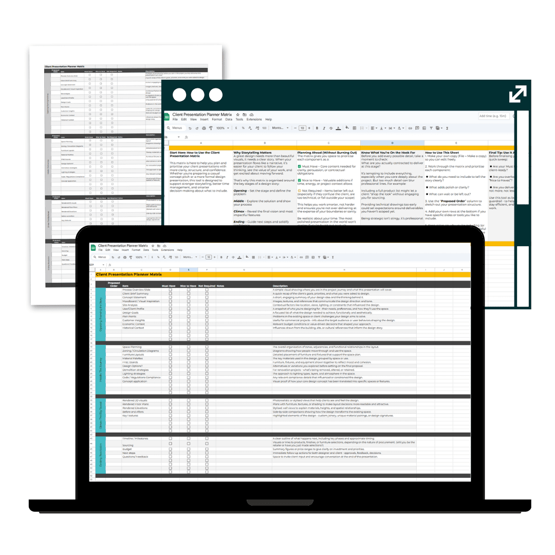 Preview of the Client Presentation Planner Matrix showing checklists and flow guidance.